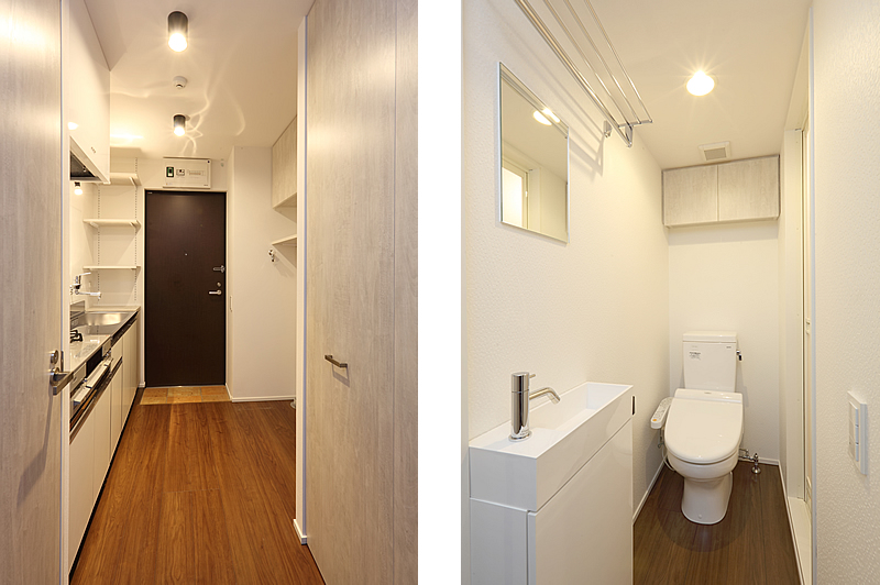 | トイレ吊戸にも扉を付け、見た目にも美しく収納して頂けます・手前はタオル掛け&置場 |